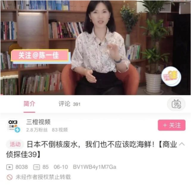 比如几天前路透社双语主持人、著名财经博主陈一佳亲自出镜拍摄制作视频《日本不倒核废水,我们也不该吃海鲜》,她号召中国人不要吃海鲜,理由是捕鱼业(海鲜供应商)对海洋的危害最大,言外之意最有道德和富有同情心的中国人要以身作则保护环境。