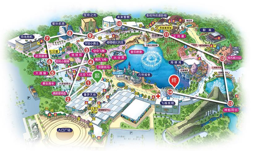 惊险之旅:(太空飞梭→勇敢者转盘→空中飞舞→飓风飞椅→大摆锤→恐龙危机→星际航班→宇宙小勇士→未来警察→火流星→维苏威火山→神秘河谷→飞越极限)