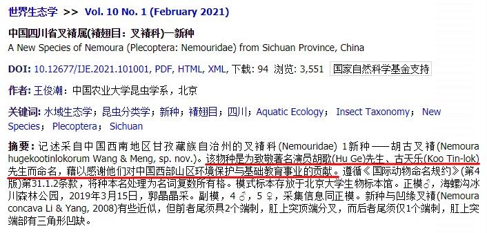 文章的摘要提到,该物种是为了致敬胡歌、古天乐而命名,以此感谢他们对中国西部山区环境保护与基础教育事业的贡献。